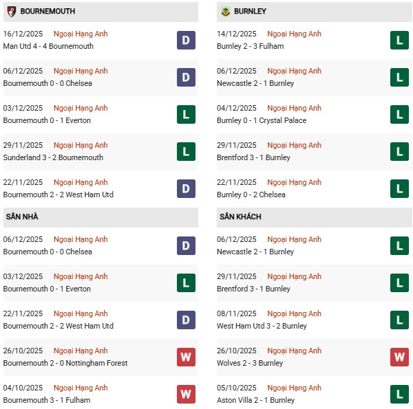 Phong độ 10 trận gần nhất của Bournemouth không quá ấn tượng với 2 chiến thắng, 4 trận hòa và 4 thất bại, tuy nhiên điểm tích cực là họ ít khi để thua liên tiếp. Trên sân nhà Vitality, Bournemouth thi đấu ổn định hơn đáng kể khi thắng 4, hòa 4 và chỉ thua 2 trong 10 trận gần đây. Lối chơi kiểm soát bóng tốt, khả năng pressing ở cường độ cao giúp Bournemouth thường chiếm ưu thế trước các đội bóng có hàng thủ yếu như Burnley.