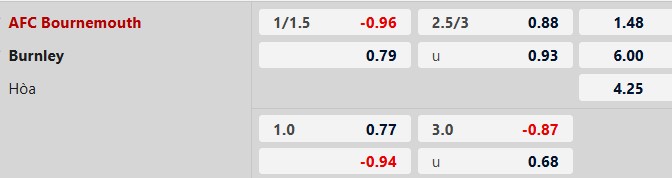Với lợi thế sân nhà cùng phong độ vượt trội, Bournemouth được xếp ở cửa trên với mức chấp 1 1/4 bàn. Đây là mức kèo phản ánh đúng sự chênh lệch giữa hai đội ở thời điểm hiện tại. Trước một Burnley đang sa sút nghiêm trọng và có thành tích sân khách rất kém, Bournemouth hoàn toàn có cơ sở để hướng tới chiến thắng với cách biệt từ 2 bàn trở lên. Do đó, lựa chọn Bournemouth -1 1/4 được đánh giá là phương án sáng giá.