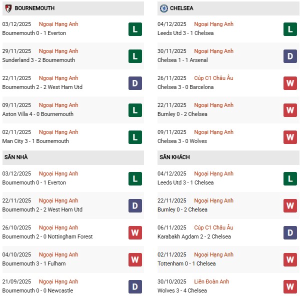 Thành tích đối đầu Bournemouth vs Chelsea: