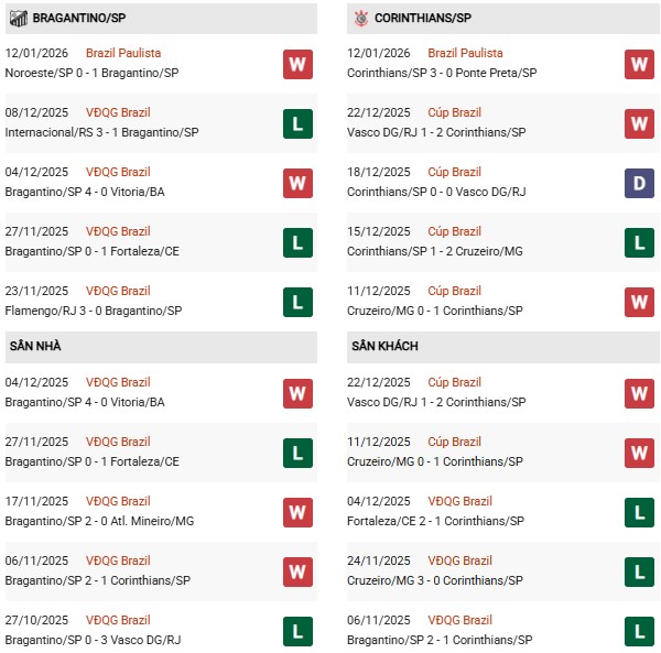 Tuy nhiên, khi phải thi đấu xa nhà, Corinthians lại chưa mang đến sự yên tâm tuyệt đối. Trong 10 chuyến làm khách gần đây, họ thắng 4, hòa 1 và thua tới 5 trận. Đội bóng này đôi lúc gặp vấn đề trong việc kiểm soát thế trận trên sân đối phương, đặc biệt khi bị ép phải chơi ở cường độ cao. Dù vậy, với chất lượng đội hình và kinh nghiệm chinh chiến dày dạn tại các giải đấu quốc nội, Corinthians vẫn được kỳ vọng sẽ chơi sòng phẳng và sẵn sàng đôi công với Bragantino.