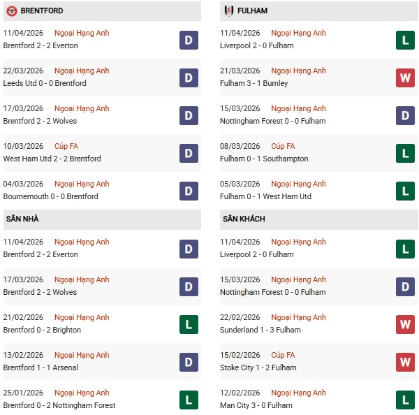 Thống kê phong độ Brentford vs Fulham: