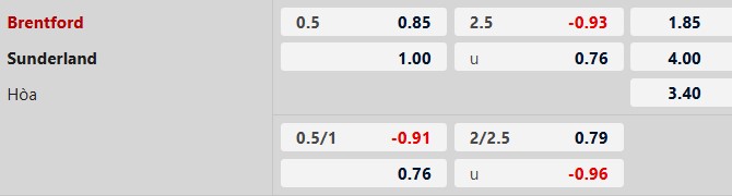 Thông tin tỷ lệ kèo Brentford vs Sunderland: