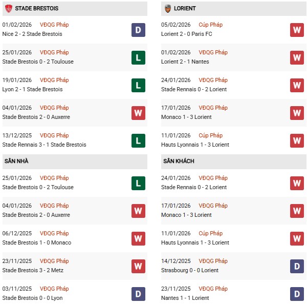 - Trên sân nhà, Brest thắng 6, thua 3 trước Lorient.
