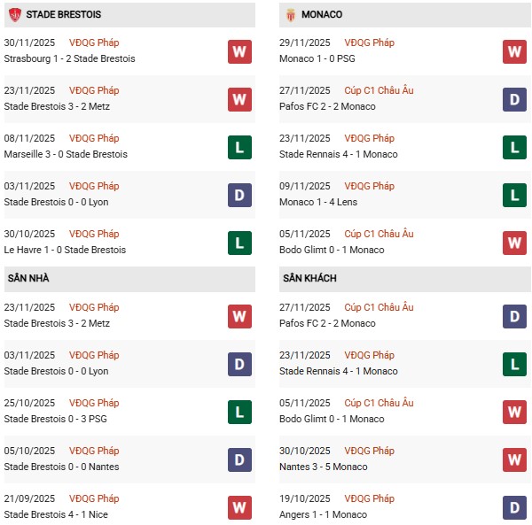 Thống kê phong độ Brest vs Monaco: