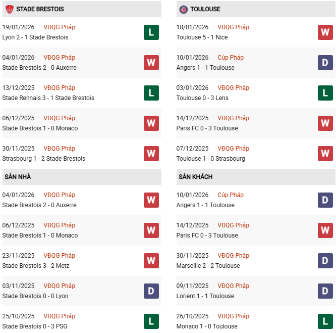- Trên sân nhà, Brest thắng 2, thua 2 trước Toulouse.