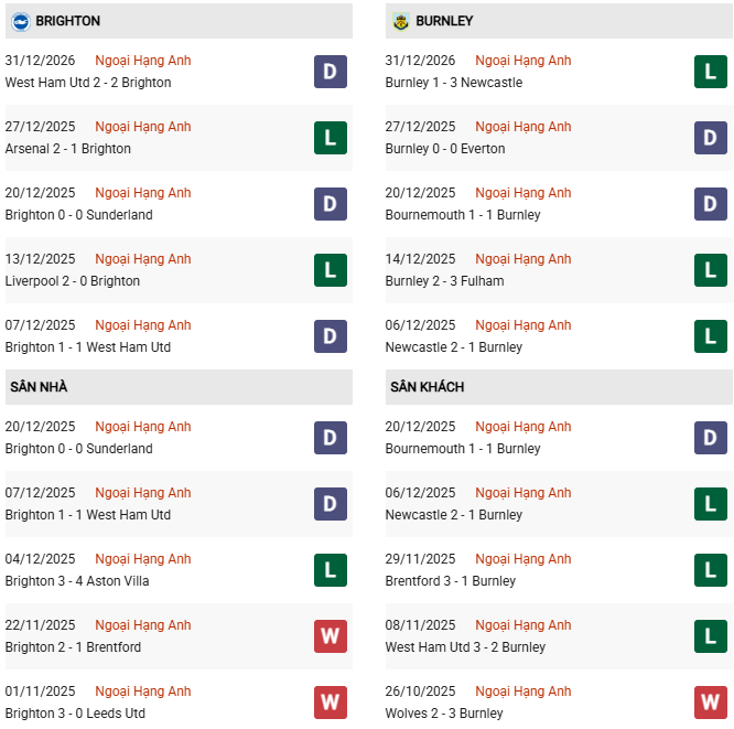 Thống kê phong độ Brighton vs Burnley: