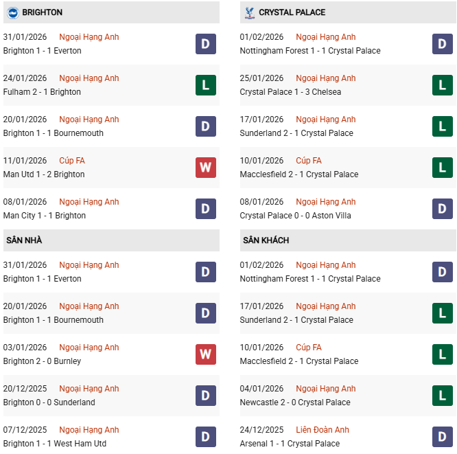Thống kê phong độ Brighton vs Crystal Palace: