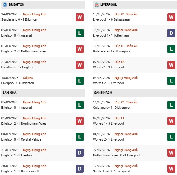 Thống kê phong độ Brighton vs Liverpool:
