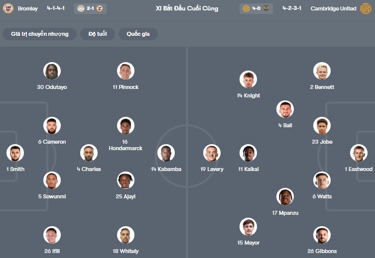 Ở phía đối diện, Cambridge United đang xếp thứ 3 với 77 điểm và thi đấu ít hơn 1 trận, qua đó nắm trong tay cơ hội lớn để thu hẹp khoảng cách với chính Bromley. Dưới sự dẫn dắt của HLV Neil Harris, Cambridge thể hiện phong độ khá tích cực khi thắng 2, hòa 2 và chỉ thua 1 trong 5 trận gần nhất. Đáng chú ý, họ vừa có chiến thắng ấn tượng 4-0 trước Notts County, cho thấy hàng công đang đạt hiệu suất cao.