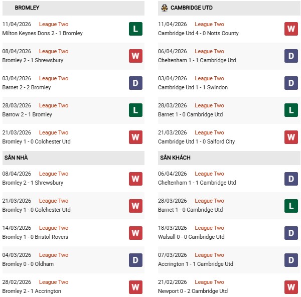 - Bromley hòa 2, thua 1 trong 3 trận gặp Cambridge gần đây.