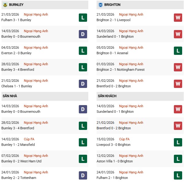 - Trên sân nhà, Burnley thắng 2, thua 3 trước Brighton.