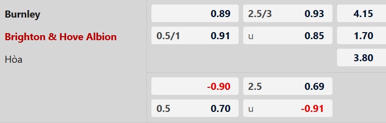 Mức chấp 3/4 bàn cho thấy Brighton được đánh giá cao hơn đáng kể. Đây là tỷ lệ hợp lý nếu nhìn vào phong độ trái ngược của hai đội. Trong khi Burnley thi đấu thiếu ổn định và phòng ngự kém hiệu quả, Brighton lại đang vào phom và sở hữu lối chơi gắn kết. Với sự vượt trội hiện tại, đội khách đủ khả năng giành trọn 3 điểm.