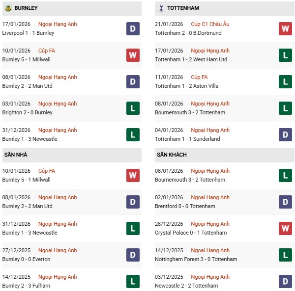Trong khi Burnley đang lên tinh thần sau khi liên tiếp cầm hòa các “ông lớn” tại giải Ngoại hạng Anh, thì Tottenham lại gặp vấn đề. Theo thống kê, Gà trống đang trải qua chuỗi 5 trận liên tiếp không thắng tại giải nội địa. Trong đó, họ thua 3 trận gần đây nhất. Đặc biệt, ở vòng đấu mới nhất tại Premier League, đội bóng của ông Thomas Frank để thua 1-2 ngay trên sân nhà trước đội đang vật lộn trụ hạng West Ham.