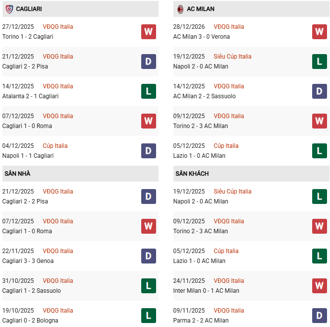 Sân nhà cũng không hẳn là lợi thế của Cagliari, khi mà họ chỉ giành được 2 chiến thắng trong 10 lần tiếp đón các đối thủ gần đây. Trong khi đó, Milan có truyền thống chơi tốt trong các chuyến ghé thăm Unipol Domus. Theo thống kê, đội bóng thành Milano bất bại trong 7 chuyến hành quân gần đây đến sân của Cagliari trong khuôn khổ Serie A, trong đó họ 5 lần chiến thắng ra về.