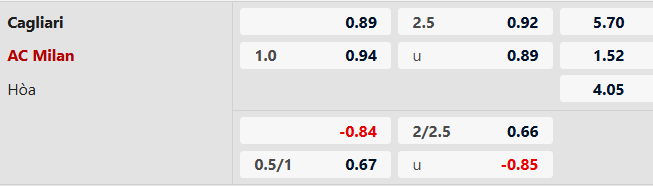 Thông tin tỷ lệ kèo bóng đá Cagliari vs Milan: