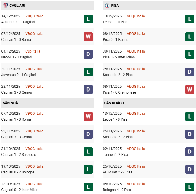 Thống kê phong độ Cagliari vs Pisa: