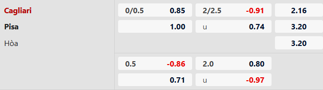 Nhận định kèo châu Á Cagliari vs Pisa: