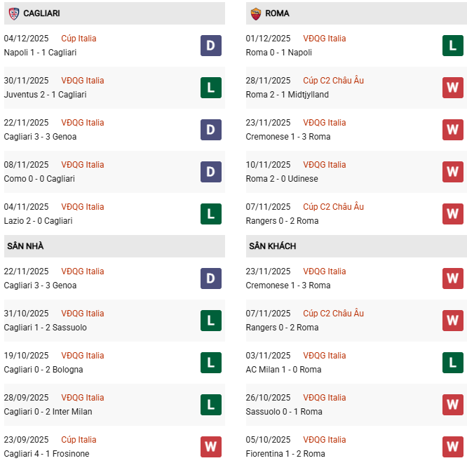 - Cagliari thắng 1, hòa 2, thua 7 trong 10 trận gặp Roma gần đây.