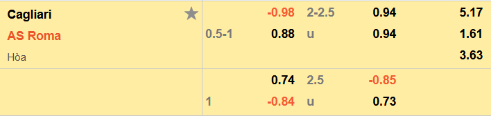 Thông tin tỷ lệ bóng đá Cagliari vs Roma: