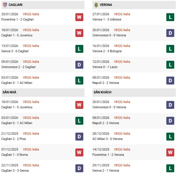 Thống kê phong độ Cagliari vs Verona: