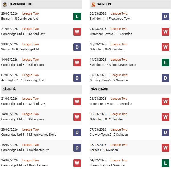 - Cambridge thắng 1, hòa 2, thua 5 trong 8 trận gặp Swindon gần đây.