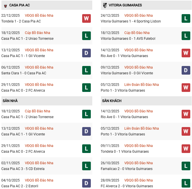 Thống kê phong độ Casa Pia vs Vitoria Guimaraes: