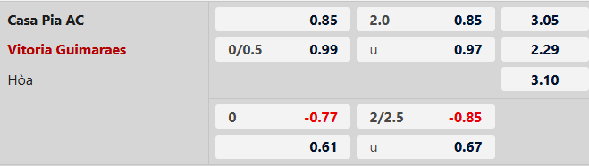 Thông tin tỷ lệ Casa Pia vs Vitoria Guimaraes: