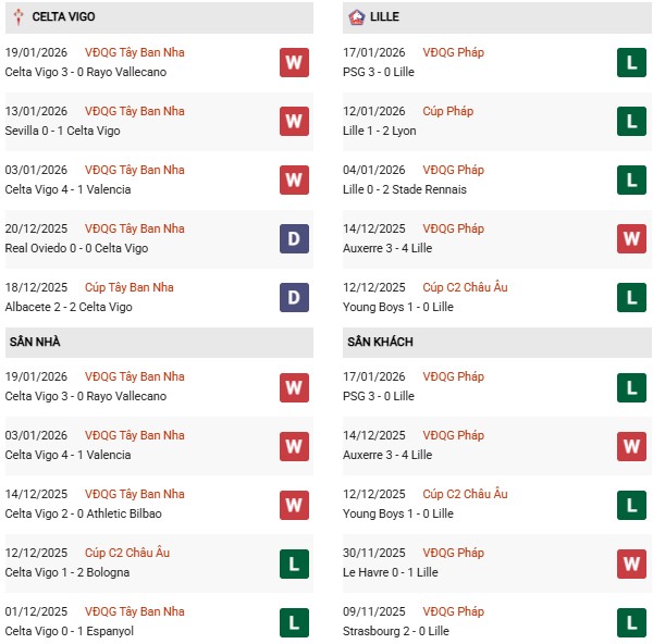 Celta Vigo giữ sạch lưới nhà: Celta Vigo giữ sạch lưới nhà ở 6/8 trận gần nhất. Họ cũng không để thủng lưới bàn nào ở 2/3 trận sân nhà vừa qua. Ngoài ra, Lille không có khả năng xuyên thủng lưới đối phương ở 2/3 trận gần nhất, ở 5/7 chuyến xa nhà vừa qua.