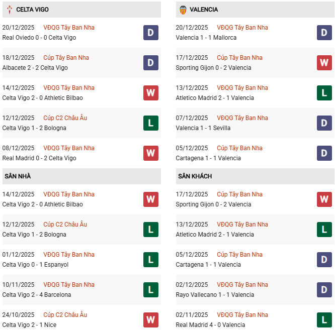 Thống kê phong độ Celta Vigo vs Valencia: