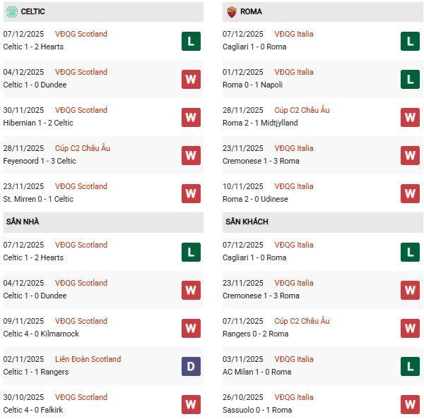 Thống kê phong độ Celtic vs Roma: