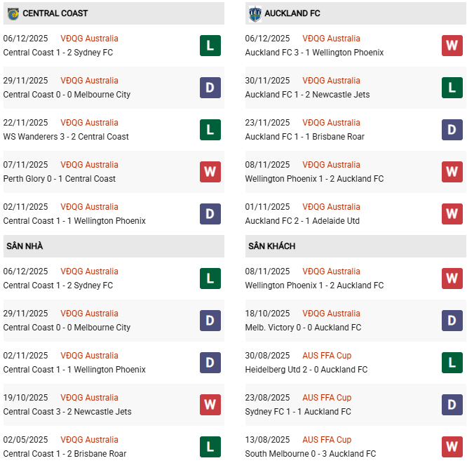 - Central Coast hòa 1, thua 1 trong 2 trận đối đầu Auckland gần đây.