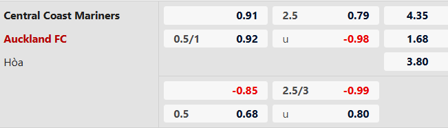 Thông tin tỷ lệ Central Coast vs Auckland: