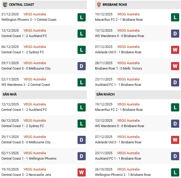 Thống kê phong độ Central Coast vs Brisbane Roar: