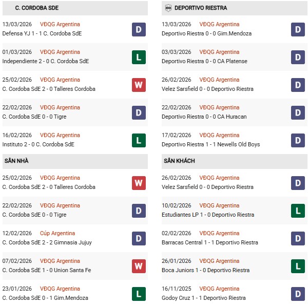 - Central Cordoba hòa 1, thua 2 trong 3 trận gặp Riestra gần đây.