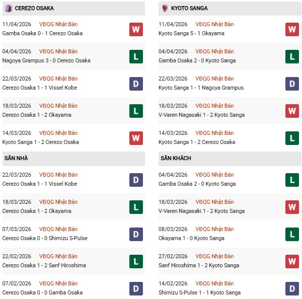 - Trên sân nhà, Cerezo Osaka thắng 2, thua 5 trước Kyoto Sanga.