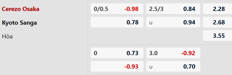 Thông tin tỷ lệ Cerezo Osaka vs Kyoto Sanga: