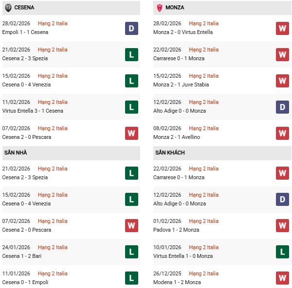 - Cesena thắng 1, thua 2 trong 3 trận đối đầu Monza gần đây.