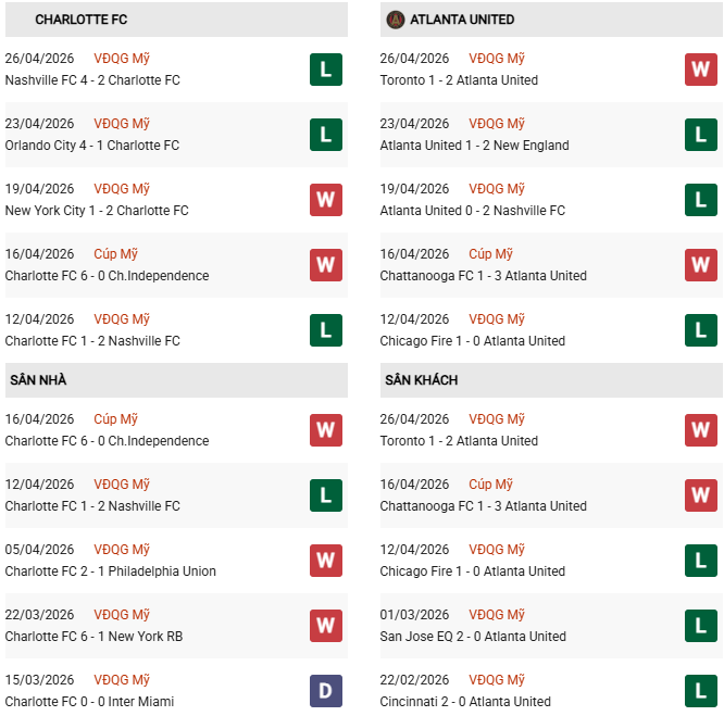 - Trên sân nhà, Charlotte thắng 2, thua 2 trước Atlanta United.