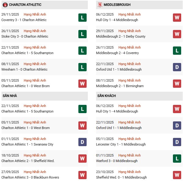 Trên sân khách, Middlesbrough thể hiện lối chơi chắc chắn và hiệu quả với 4 thắng, 4 hòa và 2 thua trong 10 lần xa nhà gần đây. Hàng thủ chơi kỷ luật, trong khi khả năng chiếm lĩnh tuyến giữa tốt giúp họ luôn tạo ra thế trận kiểm soát. Dù đối mặt Charlton có phong độ sân nhà cao, Middlesbrough vẫn được đánh giá nhỉnh hơn nhờ sự đồng đều trong đội hình và đẳng cấp vượt trội.