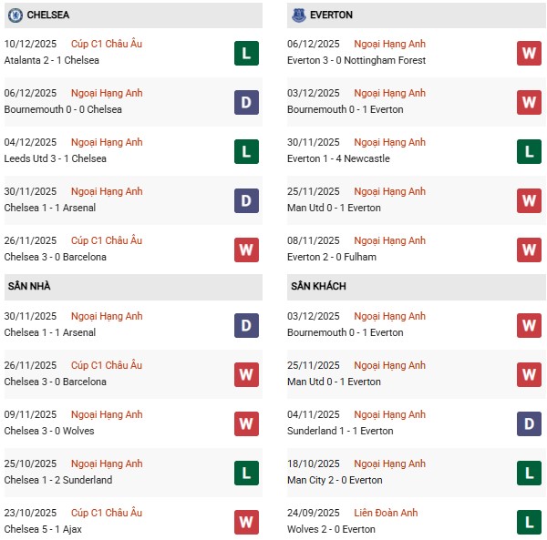Thống kê phong độ Chelsea vs Everton: