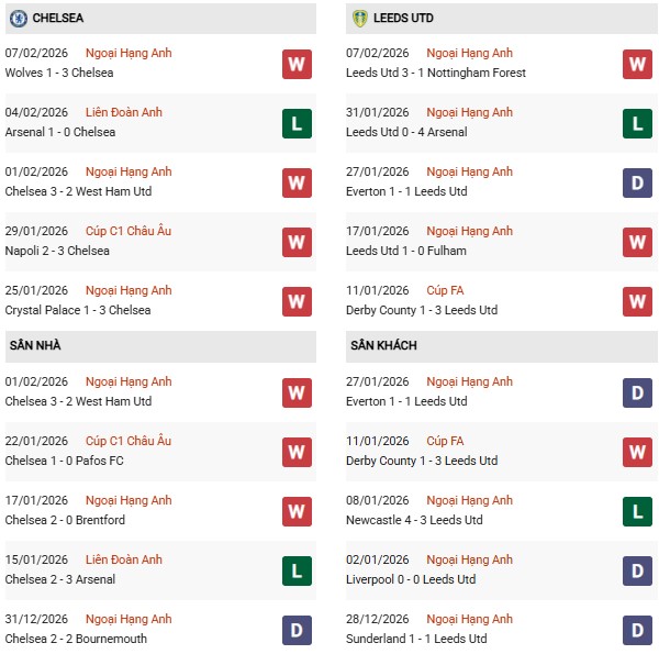 - Trên sân nhà, Chelsea thắng cả 5 trận trước Leeds United.