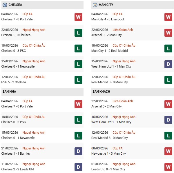 Thống kê phong độ Chelsea vs Man City: