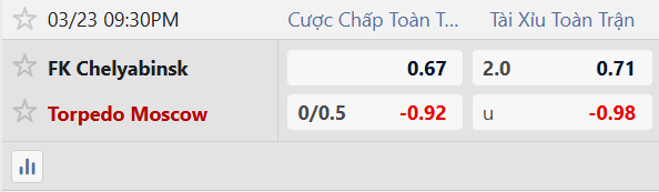 Dù phải làm khách, Torpedo Moscow vẫn được xếp cửa trên với mức chấp 1/4 bàn, cho thấy đánh giá khá cân bằng nhưng có phần nghiêng về đội khách. Tuy nhiên, xét về vị trí trên bảng xếp hạng cũng như phong độ gần đây, Chelyabinsk lại đang thể hiện sự ổn định hơn.
