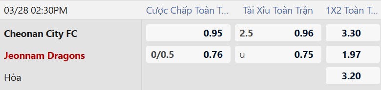Thông tin tỷ lệ kèo Cheonan vs Jeonnam Dragons:
