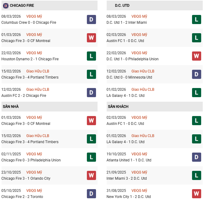 - Chicago Fire thắng 3, hòa 4, thua 3 trong 10 trận gặp DC United gần đây.