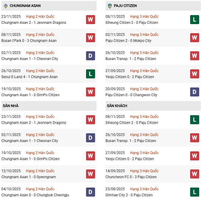 Thống kê phong độ Chungnam Asan vs Paju Frontier: