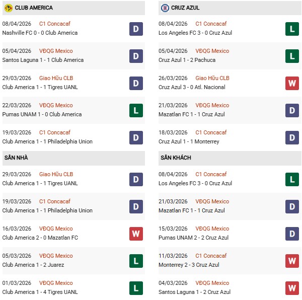 - Trên sân nhà, Club America thắng 4, thua 1 trước Cruz Azul.