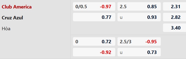 Thông tin tỷ lệ kèo Club America vs Cruz Azul: