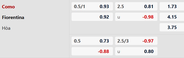 Como thắng theo châu Á: Sau giai đoạn ngắn thăng hoa, Fiorentina lại rơi vào khủng hoảng khi thua theo châu Á cả 4 trận gần đây. Como thắng theo châu Á 3/4 trận sân nhà vừa qua ở Serie A khi nhường 1/2 đến 1 bàn. Como cũng thắng theo châu Á cả 3 lần gần nhất chạm trán Fiorentina.