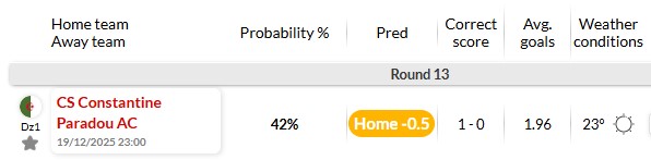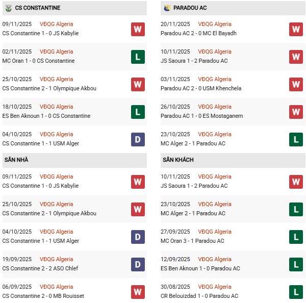 Dù vậy, phong độ 10 trận gần nhất của Paradou lại khá ấn tượng khi họ thắng 6 và thua 4 trận. Tuy nhiên, thành tích sân khách là điểm yếu rõ rệt khi Paradou chỉ thắng 2, hòa 1 và để thua tới 7 trong 10 chuyến hành quân gần đây. Việc thường xuyên chơi dưới sức khi xa nhà khiến Paradou khó tạo ra bất ngờ trước Constantine.